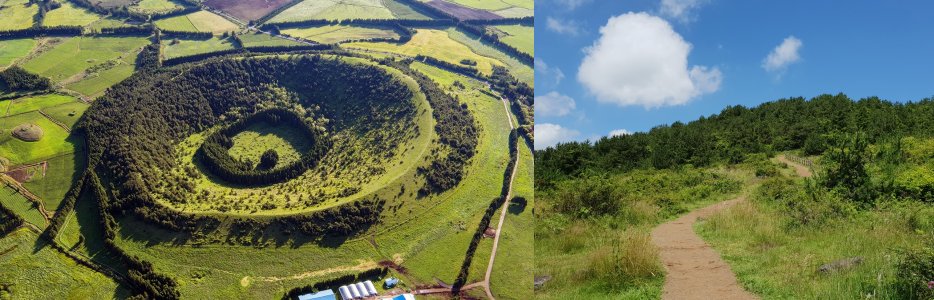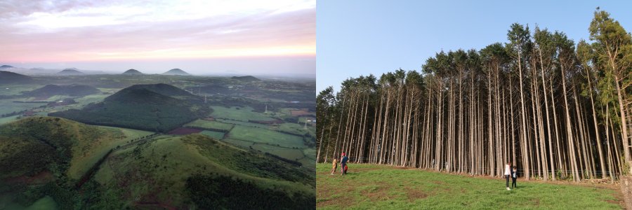 오름 둘레까지 오르는데 어렵지 않게 오를 수 있어 제주오름의 모습을 가깝게 느낄 수 있기때문에 최근 각광받고 있습니다. 오름 정상에 함지박과 같은 둥그런 굼부리가 파여 있습니다. 특히 굼부리 안 원형 삼나무숲의 특징적인 모습이 주목받고 있습니다.